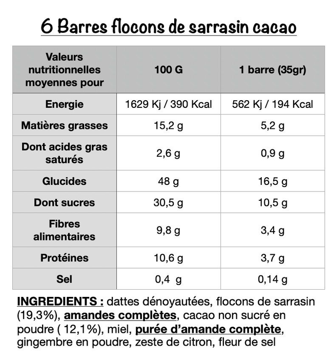 6 Barres énergétiques SARRASIN CACAO